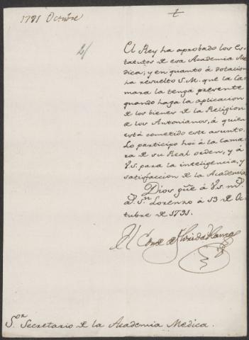 Título: San Lorenzo (Madrid), 13-X-1791. El Conde de Floridablanca comunica a la Academia la aprobación de sus Estatutos y la aplicación de los bienes de los antonianos para su dotación