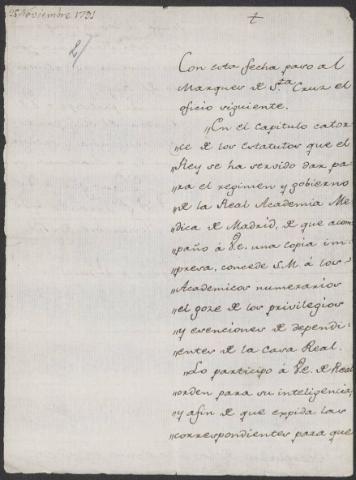 Título: San Lorenzo (Madrid), 25-XI-1791. El Conde de Floridablanca traslada al Marqués de Santa Cruz el oficio en virtud del cual el Rey concede a los académicos numerarios "el goze de los privilegios y esenciones de dependientes de la Casa Real"